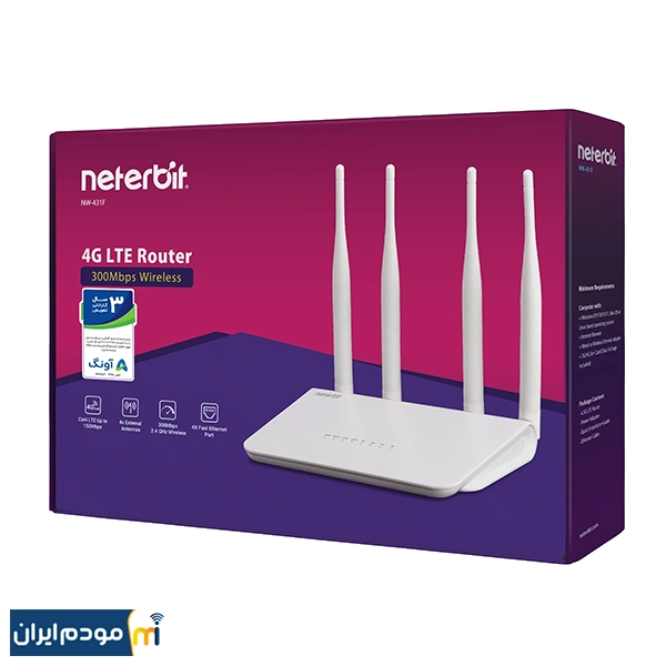 مودم 4G/3G نتربیت مدل NW-431F یک روتر رومیزی است که از باندهای فرکانسی شبکه های ایران پشتیبانی میکند و امکان دسترسی به اینترنت پرسرعت با حداکثر سرعت دانلود ۱۵۰ مگابیت بر ثانیه را فراهم میسازد.