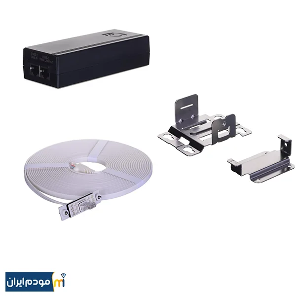 اقلام موجود در جعبه : مودم ، کابل LAN ، دستگاه POE و کابل اتصال به برق ، کابل طویل برای اتصال از مودم به POE ، پیچ و موارد مربوط به اتصال مودم به دیوار
